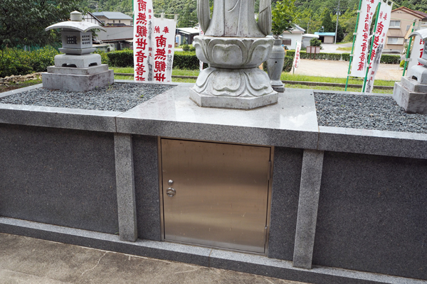 この「宝珠観音」にいだかれた永代供養塔にご遺骨を埋葬します。過去の宗旨・宗派は問いません。また、跡継ぎの心配も要りません。個人・夫婦・親子など末長く、当山で御遺骨をお守りいたします。